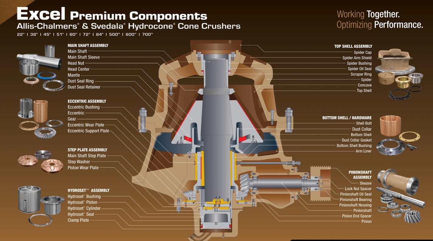 Allis Chalmers-Svedala is a mark of Metso Corporation or its affiliates. All parts are manufactured and warranted by Excel.  Crusher Parts Available for the Following Models: 22″. 36″. 45″. 51″. 60″. 72″. 84″. 500™. 600™. 700™
