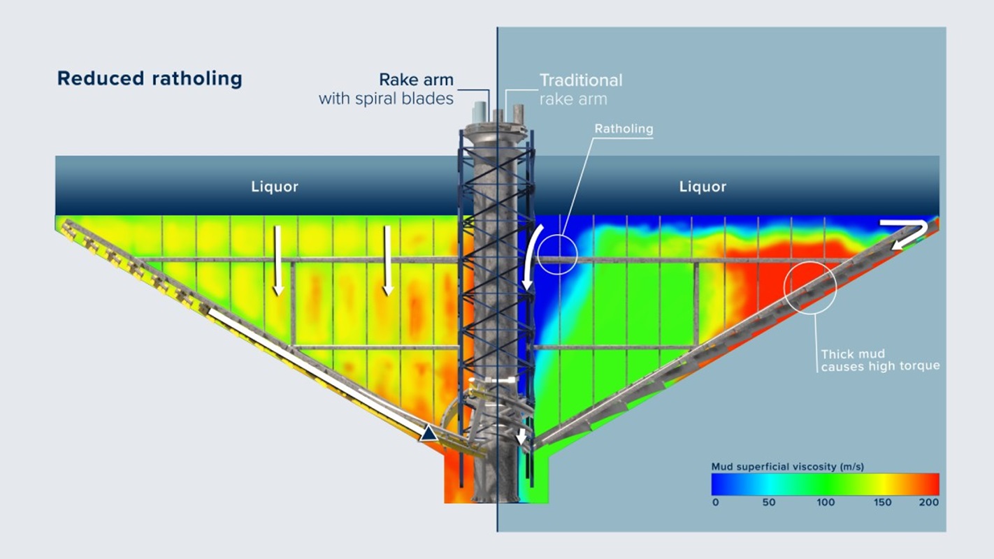 One common issue with traditional high-tonnage thickener rakes is the inability to move mud evenly to the outlet, causing the lower-viscosity material to flow out too quickly – also known as ratholing.